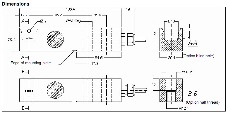 彎梁式稱重傳感器通過線纜一側(cè)的兩個緊固鉆孔安裝。而在線纜的另一側(cè),通過通孔或盲孔將力引入,垂直作用于測力傳感器的中軸線。另有一款半螺紋承載孔可供選擇。