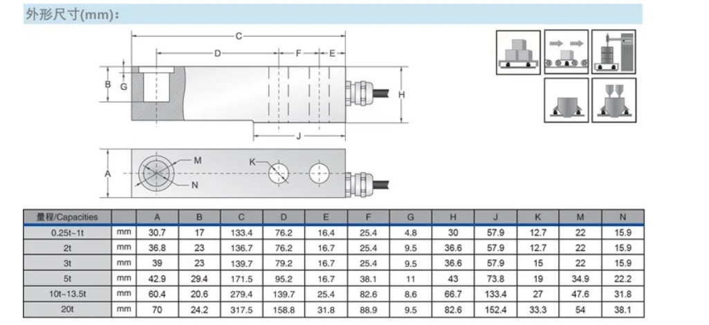 ◆ 量程范圍:250kg,500kg,1t,2t,3t,5t,10t,13.5t,20t