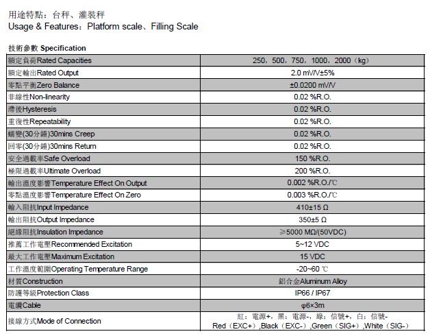 臺灣Mavin NA115稱重傳感器技術(shù)參數(shù):