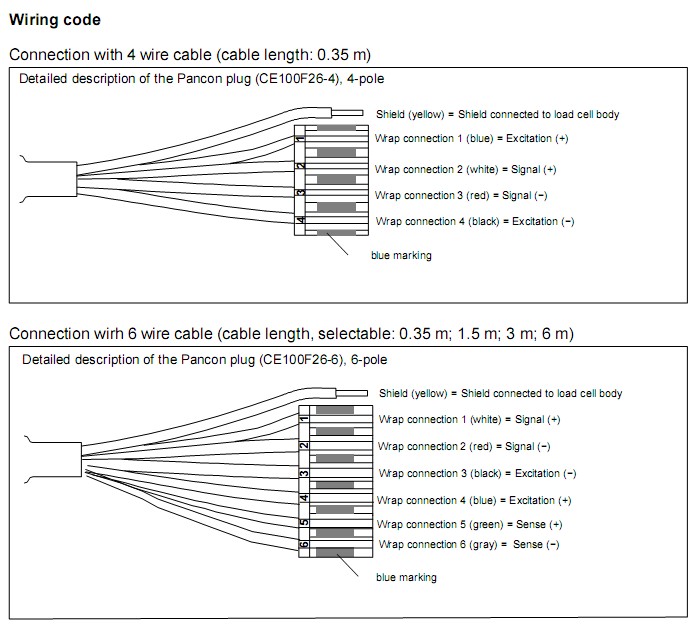 當(dāng)連接到負(fù)載細(xì)胞在六線配置校準(zhǔn)放大器與一個(gè)四線配置中,感測(cè)信息,稱重傳感器必須被連接到相應(yīng)的激勵(lì)引線。連接稱重傳感器時(shí),在一個(gè)四線配置在放大器六線的配置,有關(guān)橋必須連接在放大器的輸入端感之間的引線和激勵(lì)鉛。4線電纜連接(電纜長度:0.35米)。