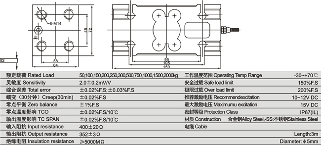 美國(guó)SUNCELLS IL-500kg稱重傳感器參數(shù)尺寸: