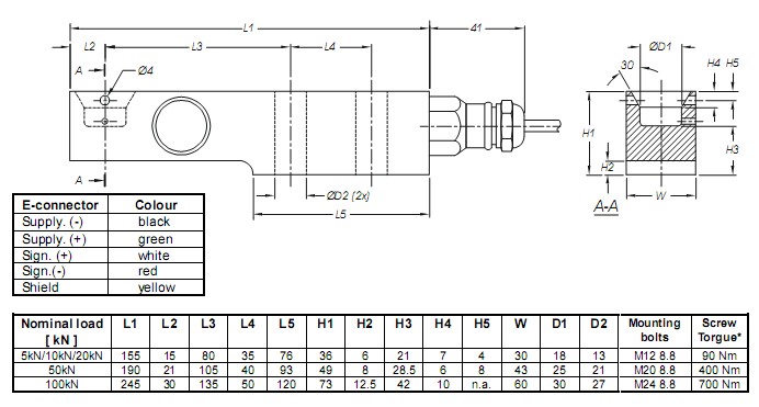 彎梁式稱重傳感器通過線纜一側(cè)的兩個(gè)緊固孔安裝。而在線纜的另一側(cè),通過通孔將力引入,垂直作用于測(cè)力傳感器的中軸線。