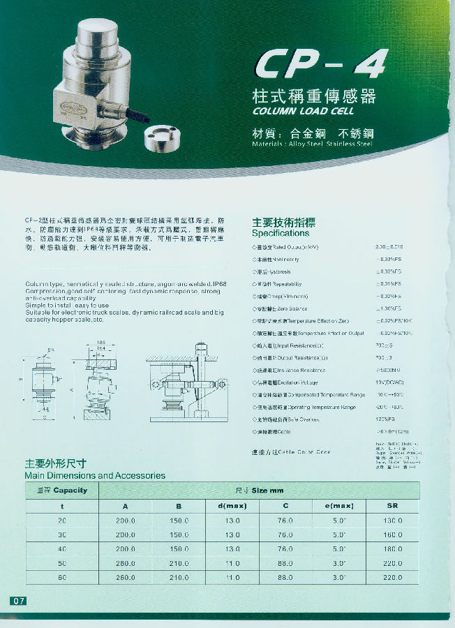 柱式CP-4傳感器是我公司專業(yè)代理銷售,高質(zhì)量的產(chǎn)品,高性能的技術(shù)指標(biāo),低廉的價(jià)格,滿足您多樣化的需求;柱式傳感器高精度,穩(wěn)定性好,互換性好,采用合金鋼材質(zhì);CP-4傳感器廣泛適用于汽車衡,軌道衡,軸重秤及地上衡。